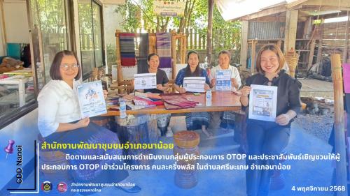 วันที่ 4 พฤศจิกายน 2568 นางชนิตา สิงห์นิกร พัฒนาการอำเภอนาน้อย พร้อมด้วยเจ้าหน้าที่สำนักงานพัฒนาชุมชนอำเภอ ติดตามและสนับสนุนการดำเนินงานกลุ่มผู้ประกอบการ OTOP และประชาสัมพันธ์เชิญชวนให้ผู้ประกอบการ OTOP เข้าร่วมโครงการ คนละครึ่งพลัส กลุ่มสตรีทอผ้าบ้านหัวเมืองและกลุ่มผ้าทอมือนาน้อย หมู่ 1 บ้านหัวเมือง ตำบลศรีษะเกษ อำเภอนาน้อย